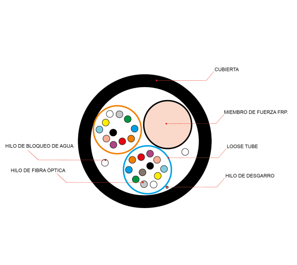 Cable dieléctrico autosoportado. Construido con uno o dos tubos holgados de PBT rellenos con gel donde se alojan los hilos de fibra y se organizan alrededor de un miembro central de FRP junto con componentes que bloquean el ingreso del agua.