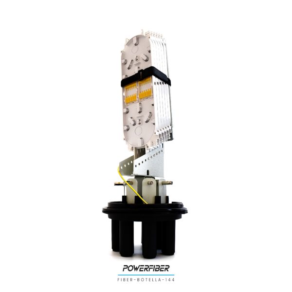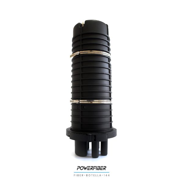 Botella de empalme para 144 fibras con 5 entradas redondas y una oval para sangría. Sistema de empalme para fusiones de fibra óptica. Permite proteger empalmes ópticos y realizar derivaciones con un diseño de reapertura eficiente y rápido. Utilizado en aplicaciones aéreas como en cámaras, su estructura presenta excelente resistencia mecánica capaz de prevenir eficazmente el envejecimiento producto de la temperatura y los rayos UV.